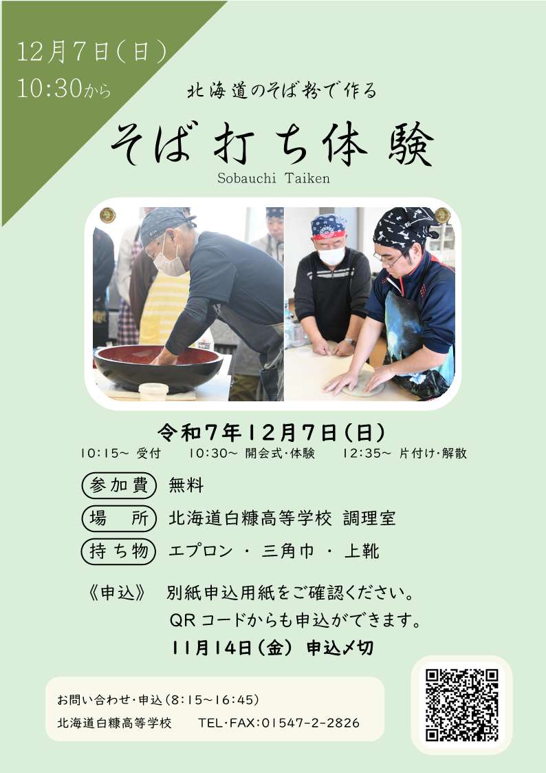 12月8日(日)に、いきいき交流会「そば打ち体験」を実施しました。そば打ち講師として廣田達郎氏をお招きし、地域住民の方々、生徒や保護者、本校職員など合わせて30名以上が、調理室にてそば打ちを体験し、交流を深めました。はじめに廣田氏に作り方の手本を示していただき、参加者はグループに分かれてそば粉を練っていきました。水の量や生地の練り方などを互いに相談し、作業を分担しながら、そばを切って茹でるまでを協力して行いました。最後には、できあがった手打ちそばを皆で美味しくいただきました。
